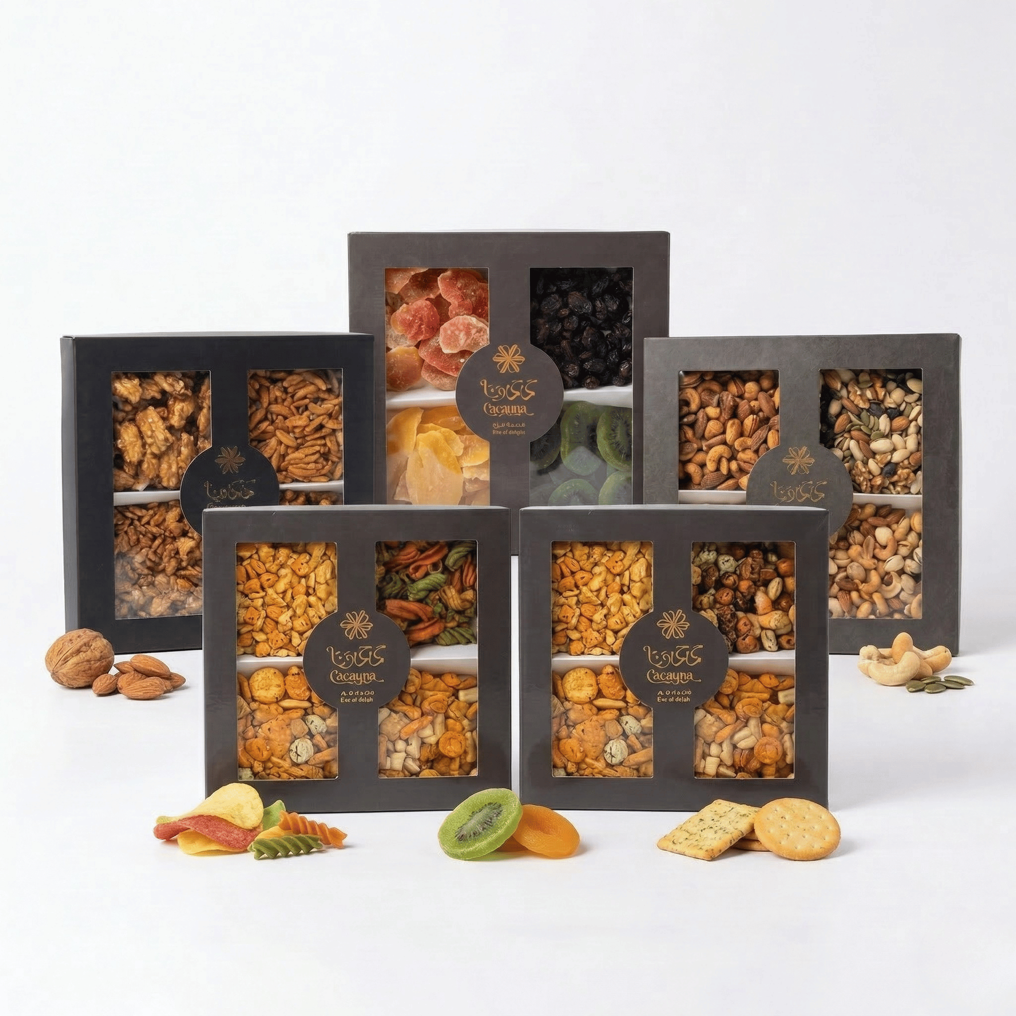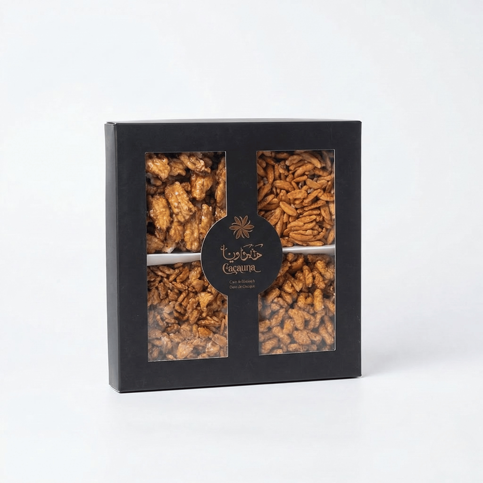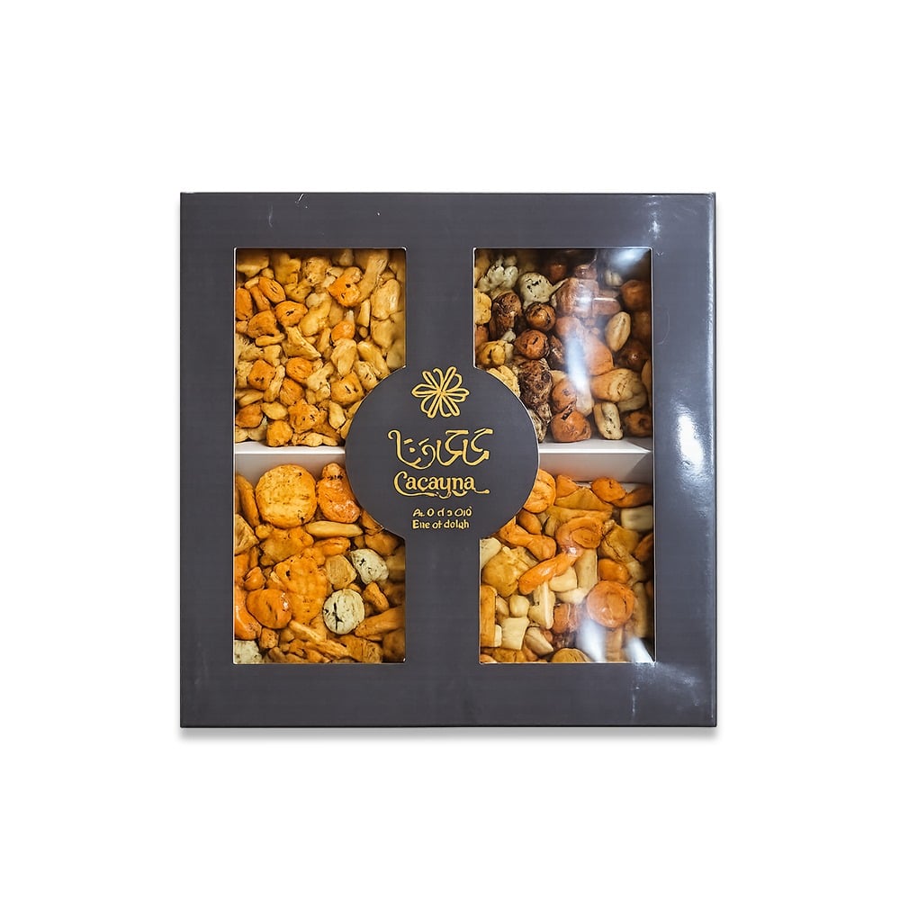 - بوكس المكسرات الفاخرة: التشكيلة الملكية الكلاسيكية من المكسرات الطازجة والمحمصة (كاجو، لوز، بيكان).